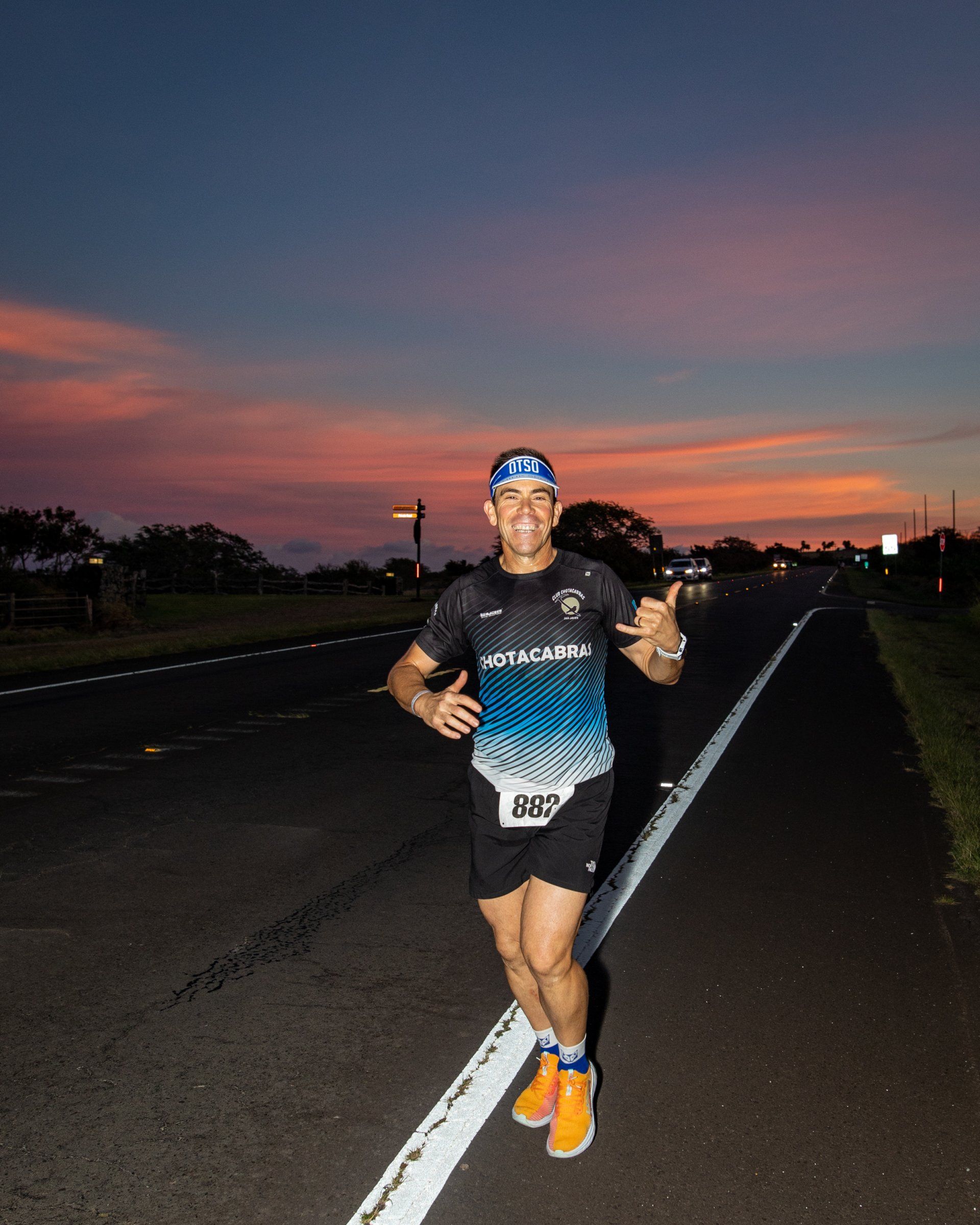 Día 2 CICLISMO 279 KMS + 2550 MTS. Salida desde volcano, con bastante fresco (12 grados), todo bajada hasta la playa y con luces (40 kms) mientras amanece, por lo que toca abrigarse bien, una vez en la playa hacemos un bucle por las inmediaciones de la ciudad de hilo (capital de Big Island), donde una vez más nos toca lidiar con algunas rampas fuertes de desnivel (15%) aunque más cortas que el día anterior, algunos se bajan de la cabra para hacerlas andando y los adelanto subiendo a 6-7 kms/hora subido en la bici, soy el único que no lleva cabra, ni acoples para los brazos (me siento más cómodo). Cruzamos hilo con mucho tráfico y semáforos (hay que parar si o si cuando está rojo), y nos dirijimos a waimea en subida larga de unos 35 kms también, después toca baja con algunos toboganes hasta la meta, llegamos sin apreturas en 11,15 horas. Este día ha sido duro, pero mucho menos que el primero, Mary y Elliot me han dado de todo para comer y he disfrutado mucho de esto también (fruta, pasteles, helados, sandwich….) La hidratación aproximadamente 1 litro por hora (isotónico, coca-cola, agua…), al terminar consigo ser el último para darme masaje (previa ducha) y tras coger algo de comida del post-meta nos vamos al apartamento a una hora de coche, al día siguiente toca madrugar algo más para volver a este sitio, donde arrancamos ultimo día.